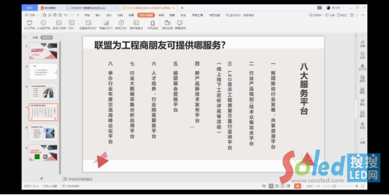 在公開課的最后,曹立新秘書長(zhǎng)對(duì)兩位講師的精彩演講做了總結(jié),并作了LED工程商聯(lián)盟的新服務(wù)項(xiàng)目介紹。當(dāng)前LED顯示屏工程商面臨國(guó)內(nèi)疫情影響、市場(chǎng)資源的瓶頸、資金鏈的短缺、產(chǎn)品選擇的誤區(qū)、產(chǎn)品價(jià)格的透明化幾大痛點(diǎn),針對(duì)這些痛點(diǎn),今年聯(lián)盟將為工程商朋友提供8項(xiàng)專業(yè)服務(wù)。同時(shí),曹秘書長(zhǎng)還對(duì)工程商朋友們提出了“練好內(nèi)功”、“抱團(tuán)取暖”、“強(qiáng)化服務(wù)”三點(diǎn)建議。