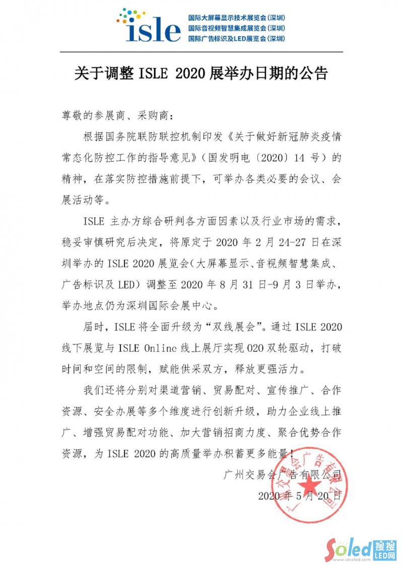 5月20日,ISLE 2020展覽會(huì)(大屏幕顯示、音視頻智慧集成、廣告標(biāo)識(shí)及LED)主辦方宣布,展會(huì)將調(diào)整至2020年8月31日-9月3日舉辦,舉辦地點(diǎn)仍為深圳國(guó)際會(huì)展中心(福永新館)