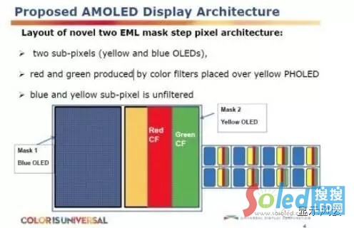 如附圖所示,他們開發(fā)的這種結(jié)構(gòu),其實就是兩大塊子像素為基礎(子像素越大,越好加工,良率越高),分別為藍色和黃色,藍色因為發(fā)光效率低易損,所以面積加大從而增加壽命及亮度;黃色的子像素分三部份,其中三分之一原色顯示,另外三分之二分別加綠色和紅色的濾光片.也就是紅綠黃藍四色顯示...這種技術(shù)在LG比較容易實現(xiàn),與其現(xiàn)有技術(shù)相差不多.而對于執(zhí)著于RGB原色顯示OLED技樣的三星來說,估計不會用。