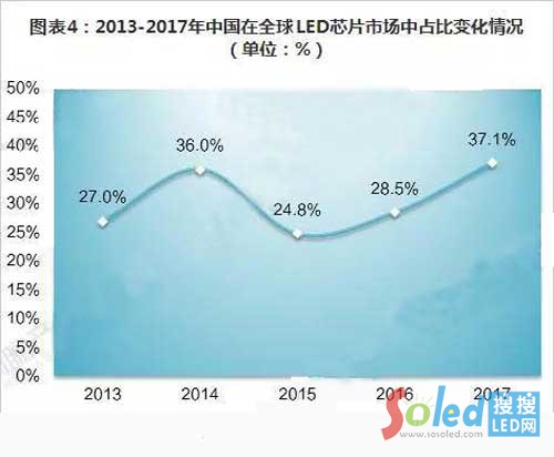 2013-2017年中國在全球LED芯片市場(chǎng)中占比變化情況(單位:%)
