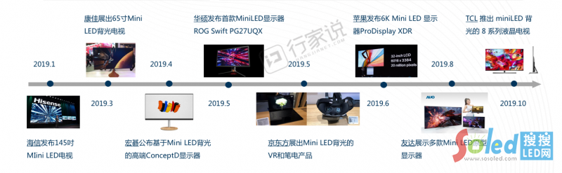 2019年,海信、康佳、華碩、群創(chuàng)、蘋果、友達(dá)、京東方等廠商紛紛推出Mini LED背光或類似技術(shù)的電視、顯示器、VR和車載顯示等終端產(chǎn)品,商業(yè)化進(jìn)程加速推進(jìn)。