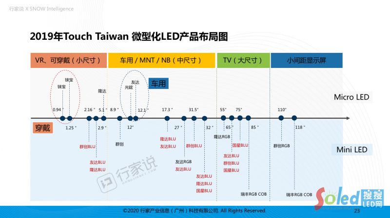Touch Taiwan展中,我們發(fā)現(xiàn),從小尺寸可穿戴,到中尺寸車用、筆記本、顯示器,再到大尺寸TV領(lǐng)域,群創(chuàng)光電和友達(dá)光電均有布局,隆達(dá)則重點(diǎn)在中小尺寸;國星光電則重點(diǎn)展示了中大尺寸層面。
