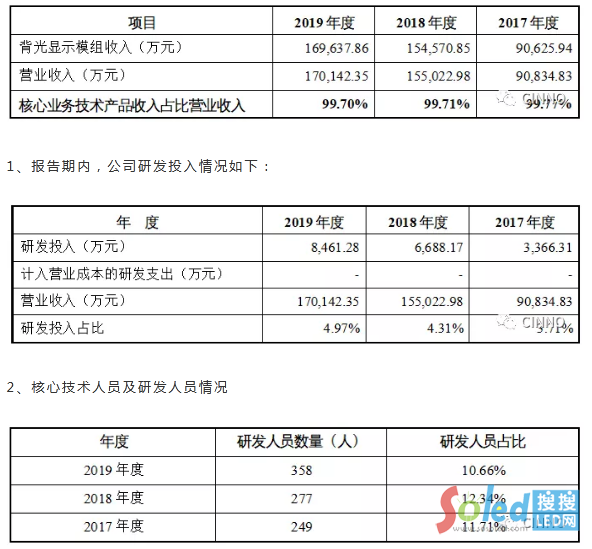 公司核心業(yè)務(wù)為背光顯示模組的研發(fā)、生產(chǎn)和銷售。核心業(yè)務(wù)技術(shù)產(chǎn)品收入占營業(yè)收入的比例如下所示: