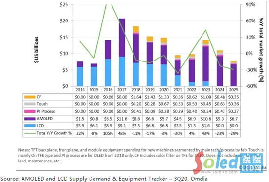 預(yù)計(jì)OLED面板市場的快速增長將推動(dòng)OLED設(shè)備市場的增長。Omdia預(yù)計(jì)2023年OLED設(shè)備市場將增長至141億美元,其中OLED設(shè)備投資預(yù)計(jì)將達(dá)到106億美元。但總投資額將落后于中國大陸面板廠商在2017年至2018年間進(jìn)行的大規(guī)模LCD投資。