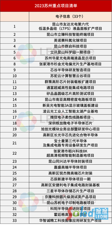其中電子信息產(chǎn)業(yè)類別項目共33個,包含了顯示友達(dá)、華星光電等廠商的顯示產(chǎn)品項目,以及英諾賽科等企業(yè)在內(nèi)的第三代半導(dǎo)體項目,以下是清單部分內(nèi)容: