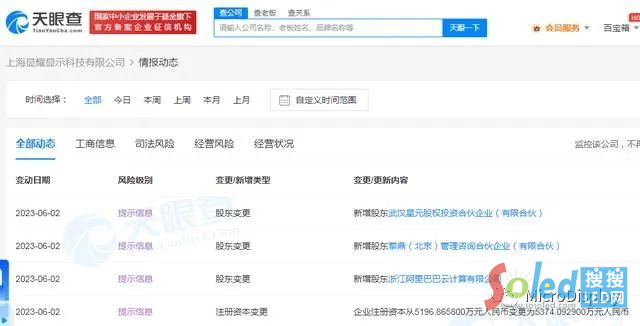 6月3日消息,據(jù)天眼查App顯示,近日,JBD關聯(lián)公司上海顯耀顯示科技有限公司發(fā)生工商變更,股東新增浙江阿里巴巴云計算有限公司等,同時公司注冊資本從約5197萬人民幣增至約5374萬人民幣。