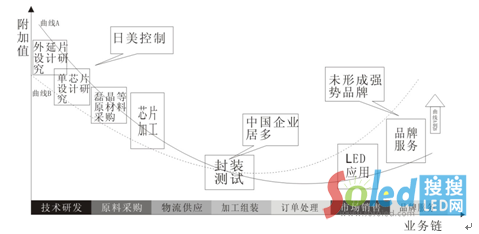 微笑到哭泣曲線LED產(chǎn)業(yè)也在經(jīng)歷,這是一組關(guān)于LED產(chǎn)業(yè)鏈附加值與業(yè)務(wù)鏈的微笑曲線圖,可以看出高附加值的外延芯片環(huán)節(jié)基本上被日美控制,也就是說(shuō)這個(gè)環(huán)節(jié)的核心技術(shù)掌握在日美企業(yè)手中,雖然中國(guó)擁有巨大的規(guī)模,但始終處在加工組裝的低端環(huán)節(jié),處于最低利潤(rùn)的競(jìng)爭(zhēng)環(huán)節(jié),可見(jiàn)未來(lái)向著品牌方向發(fā)展成為必然趨勢(shì)。