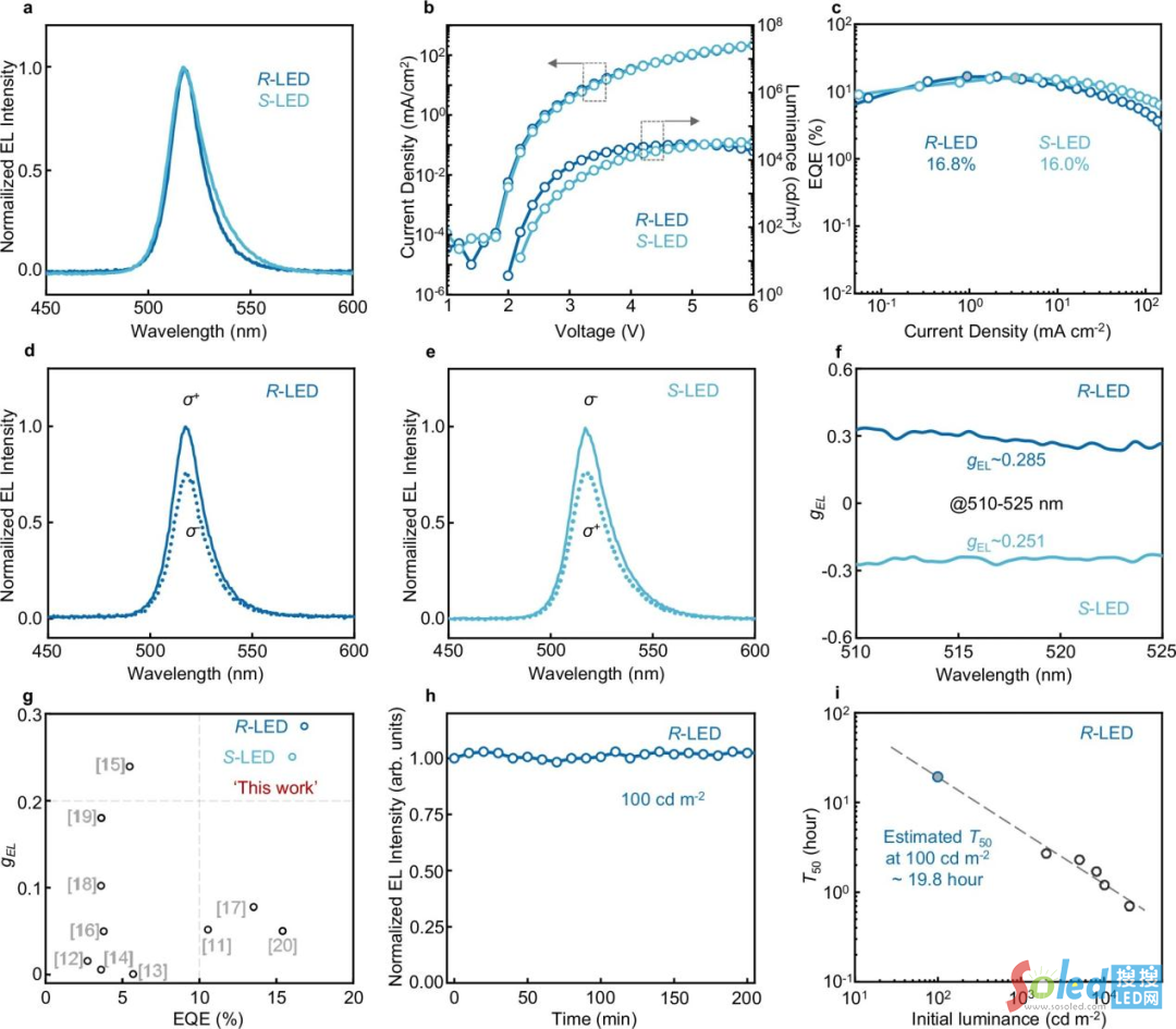 這項(xiàng)研究的核心突破在于,制備出的 R 型器件在綠光波段實(shí)現(xiàn)了高達(dá) 16.8% 的外量子效率,同時(shí)其電致發(fā)光不對(duì)稱因子達(dá)到了 0.285;S 型器件也分別達(dá)到了 16.0% 和 0.251。