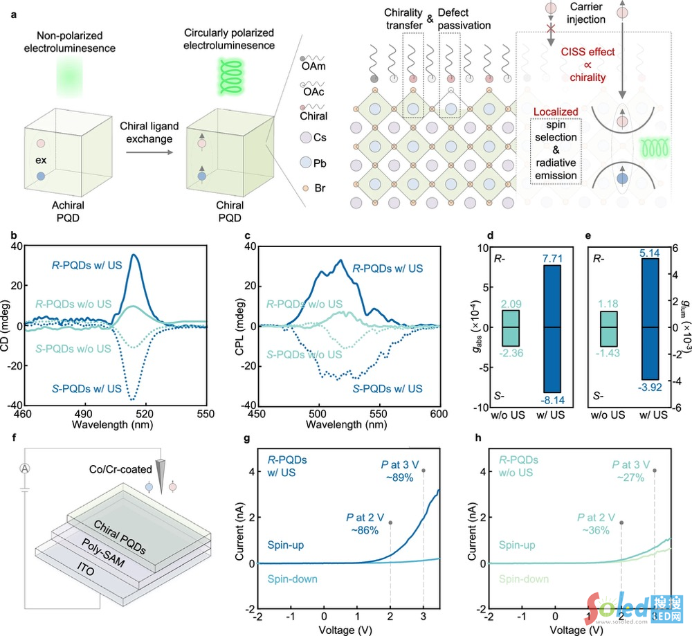 在這種機(jī)制下,手性鈣鈦礦量子點(diǎn)利用手性誘導(dǎo)自旋選擇性(CISS, chiral-induced spin selectivity)效應(yīng),高效地篩選出特定自旋方向的載流子。更關(guān)鍵的是,一旦這些自旋極化的載流子進(jìn)入量子點(diǎn),由于量子點(diǎn)的強(qiáng)限域作用,它們會(huì)迅速復(fù)合發(fā)光,沒有時(shí)間去發(fā)生自旋弛豫。