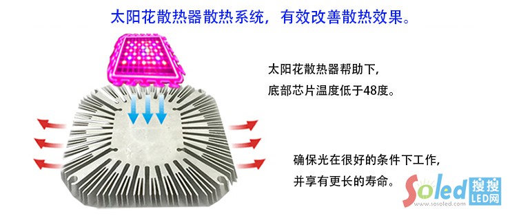LED植物燈系統(tǒng)發(fā)熱少,采用太陽花散熱器,節(jié)能省電,避免幼苗植物灼熱,占用空間小,適用于多層栽培立體組合系統(tǒng);