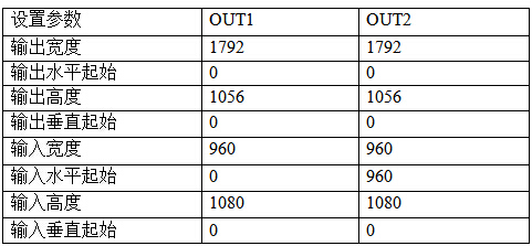 如亮線(xiàn)或暗線(xiàn)在右邊一塊屏上,則將對(duì)應(yīng)該屏幕的OUT2的輸出水平起始由0設(shè)為負(fù)數(shù)(如-2),使右側(cè)顯示屏的輸出圖像左移,進(jìn)而亮線(xiàn)或暗線(xiàn)消失。但圖像左移會(huì)造成右側(cè)屏幕幾列黑屏,我們可以將OUT2輸出寬度增加(如設(shè)為1794)來(lái)解決。